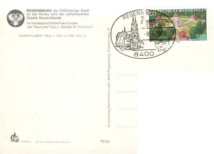 73879280 REGENSBURG Bayern Fliegeraufnahme mit Schloss des Fuersten von Thurn und Taxis und Basilika St Emmeram postalisch gelaufen Erhaltung siehe scans [WerneD78] alte Postkarte Wern Katcode 11110009362000