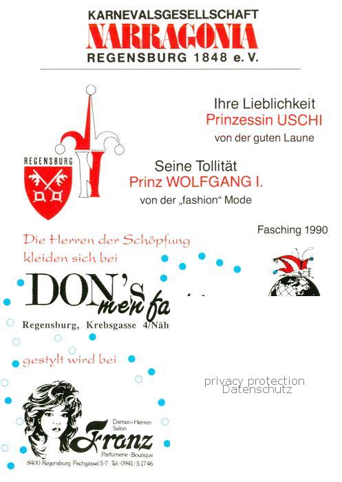73864875 REGENSBURG Bayern Prinzenpaar Karnevalsgesellschaft Narragonia postalisch nicht gelaufen Keine Postkarte (siehe scan) Erhaltung siehe scans [FriedD77] Keine Postkarte (siehe scan) Frie Katcode 11110009362000