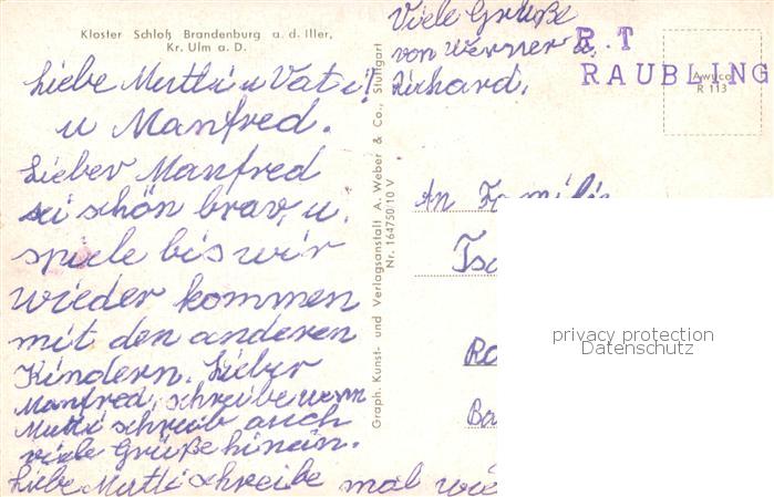 73775760 Regglisweiler Kloster Schloss Brandenburg postalisch nicht gelaufen Erhaltung siehe scans [FriedD77] KatCode: 11110008425028