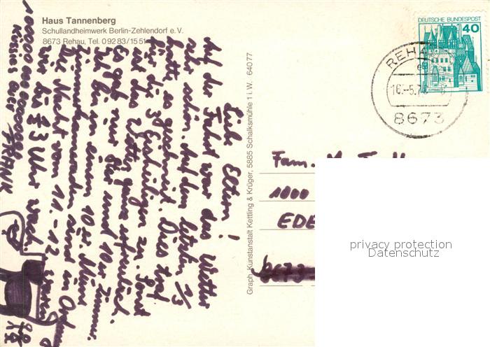 73086222 alte Postkarte Rehau Oberfranken Schullandheim Haus Tannenberg postalisch gelaufen Erhaltung siehe scans [KathaD81] KatCode: 11110009475162