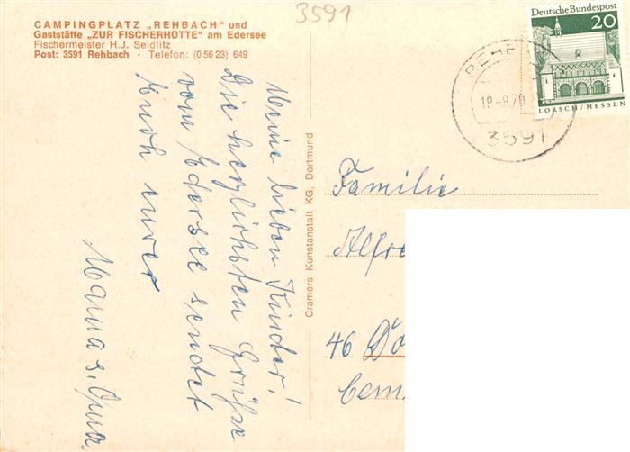 73895104 alte Postkarte Rehbach Edertal Campingplatz Rehbach am Edersee Gaststaette Zur Fischerhuette postalisch gelaufen Erhaltung siehe scans [WerneD78] KatCode: 11110006635009