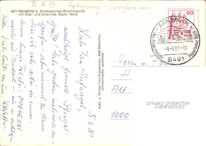 72225918 alte Postkarte Rehberg Drachselsried mit Oberried und Unterried Bayerischer Wald Fliegeraufnahme postalisch gelaufen Erhaltung siehe scans KatCode: 11110009276120