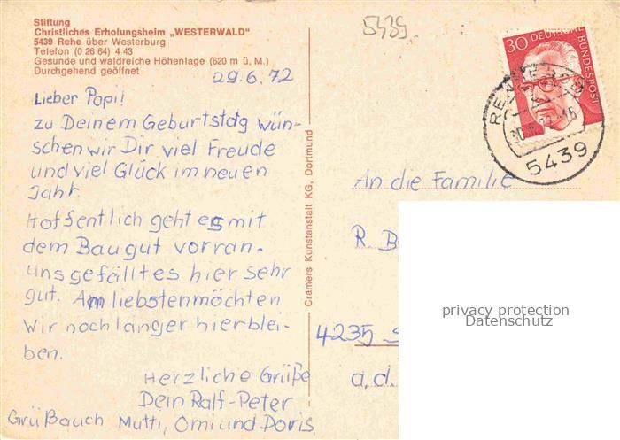 74040990 alte Postkarte Rehe Westerwald Rheinland-Pfalz Christl Erholungsheim Westerwald Stiftung Haus Bergfrieden Gesamtansicht Gastraeume postalisch gelaufen Fliegeraufnahme Erhaltung siehe scans [WerneD78] KatCode: 11110007143285