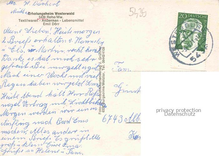 74041041 alte Postkarte Rehe Westerwald Rheinland-Pfalz Erholungsheim Westerwald postalisch gelaufen Erhaltung siehe scans [WerneD78] KatCode: 11110007143285