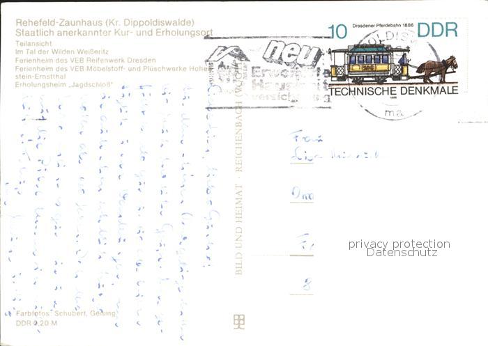 72322735 alte Postkarte Rehefeld-Zaunhaus Teilansicht Wilde Weisseritz Ferienheim VEB Dresden und VEB Ernstthal Erholungsheim Jagdschloss postalisch gelaufen Erhaltung siehe scans KatCode: 11110014290010