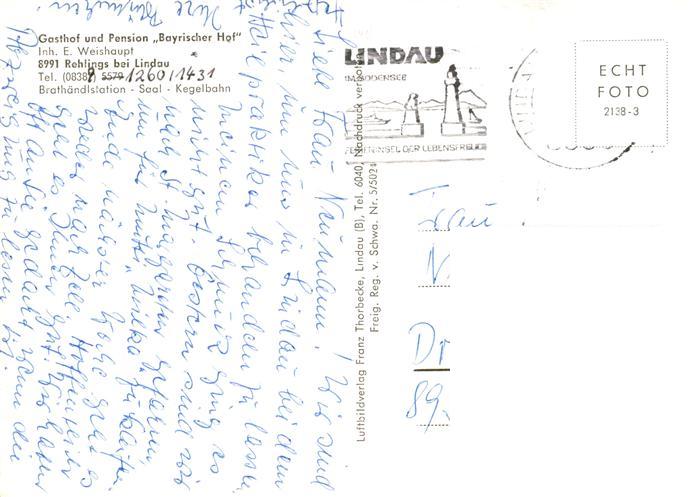 73934882 alte Postkarte Rehlings Weissensberg Lindau Gasthof Pension Bayrischer Hof postalisch gelaufen Fliegeraufnahme Erhaltung siehe scans [FriedD77] KatCode: 11110009776130