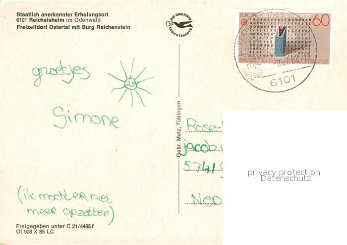 72932401 alte Postkarte Reichelsheim Odenwald Freizeitdorf Ostertal mit Burg Reichenstein Fliegeraufnahme postalisch gelaufen Erhaltung siehe scans [WerneD78] KatCode: 11110006437013