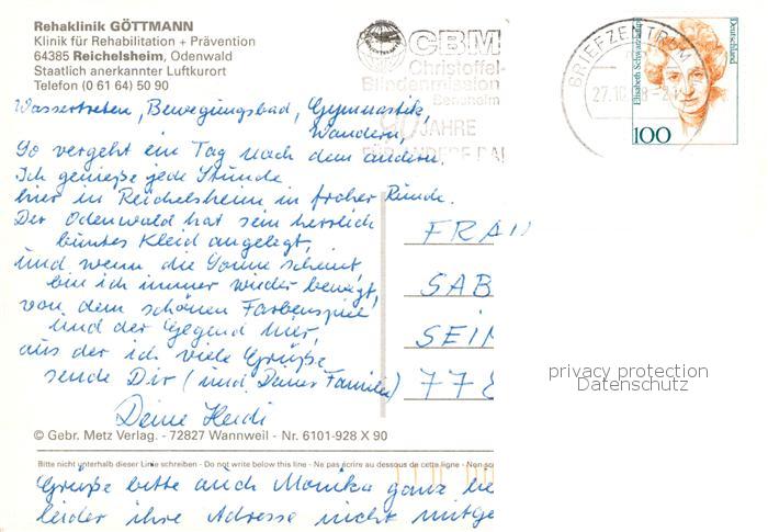 73840408 alte Postkarte Reichelsheim Odenwald Kirche Panorama Rehaklinik Goettmann postalisch gelaufen Erhaltung siehe scans [FriedD77] KatCode: 11110006437013