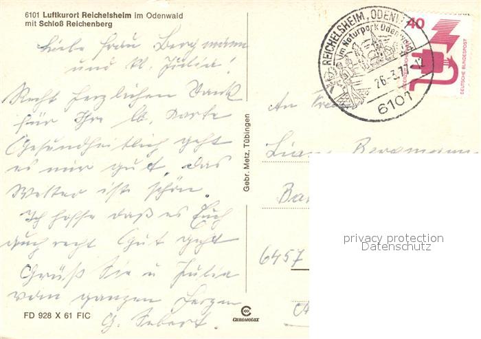 73258006 alte Postkarte Reichelsheim Odenwald Panorama Schloss Reichenberg Schwimmbad Stadtmotive postalisch gelaufen Erhaltung siehe scans [WerneD78] KatCode: 11110006437013