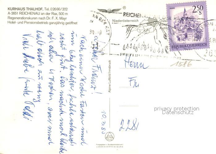 73162976 alte Postkarte Reichenau Rax Fliegeraufnahme Kurhotel Thalhof postalisch gelaufen Erhaltung siehe scans [LiesaD40] KatCode: 11390122031829