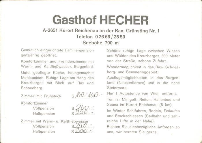 71431713 Reichenau Rax Gasthof Hecher Alpenpanorama postalisch nicht gelaufen Werbekarte (keine Postkarte) Erhaltung siehe scans KatCode: 11390122031829