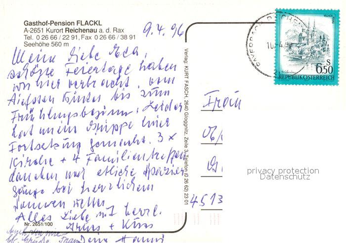 73327189 alte Postkarte Reichenau Rax Gasthof Pension Flackl postalisch gelaufen Erhaltung siehe scans [WerneD78] KatCode: 11390122031829