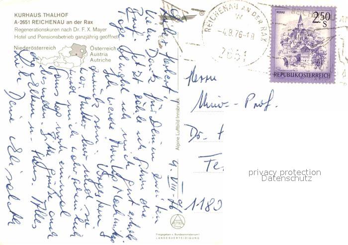 72905517 alte Postkarte Reichenau Rax Kurhotel Thalhof postalisch gelaufen Erhaltung siehe scans [NatalD47] KatCode: 11390122031829