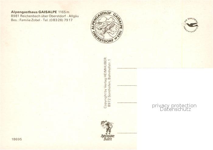 73867548 Reichenbach Oberstdorf Alpengasthof Gaisalpe Allgaeuer Stube Gaisbachtobel Gaisalp Kapelle Nebelhornblick postalisch nicht gelaufen Erhaltung siehe scans [WerneD78] KatCode: 11110009780133