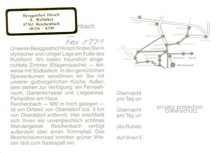 73837059 Reichenbach Oberstdorf Berggasthof Hirsch postalisch nicht gelaufen Werbekarte (keine Postkarte) Erhaltung siehe scans [FriedD77] KatCode: 11110009780133