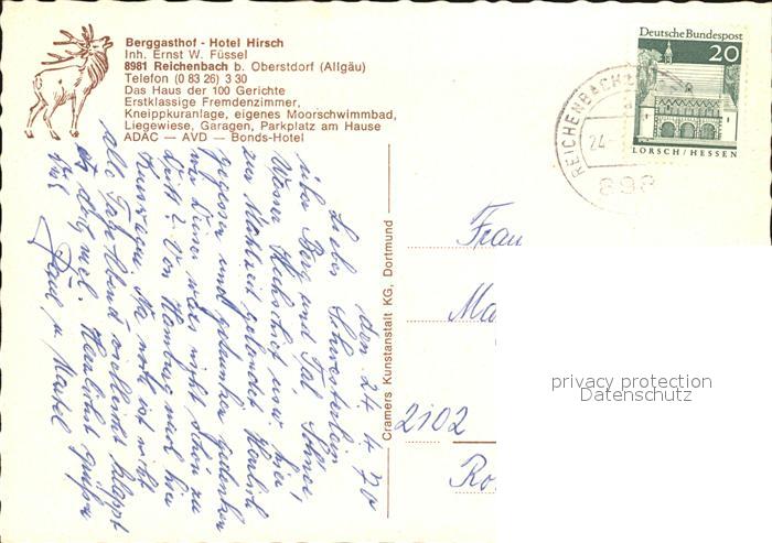 72481003 alte Postkarte Reichenbach Oberstdorf Berggasthof Hotel Hirsch postalisch gelaufen Erhaltung siehe scans KatCode: 11110009780133