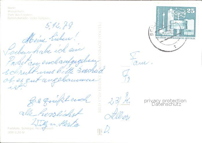 72289883 alte Postkarte Reichenbach Vogtland Markt Wasserturm Park des Friedens Bahnhofstrasse postalisch gelaufen Erhaltung siehe scans KatCode: 11110014178510