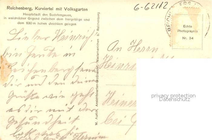 old postcard Reichenberg Liberec Boehmen Kurviertel Volksgarten postalisch gelaufen Erhaltung siehe scans [PaolaD17]