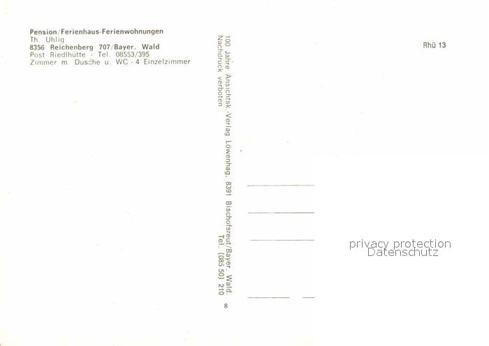72616667 Reichenberg Riedlhuette Pension Uhlig Panorama Nationalpark Bayer Wald postalisch nicht gelaufen Erhaltung siehe scans [WerneD78] KatCode: 11110009272143