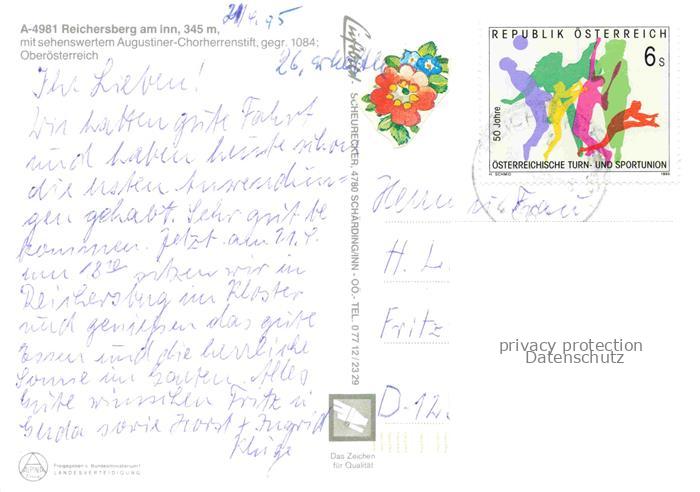 74018989 alte Postkarte Reichersberg Inn Oberoesterreich AT Augustiner-Chorherrenstift 11. Jdht. postalisch gelaufen Fliegeraufnahme Erhaltung siehe scans [FriedD77] KatCode: 11390311041224