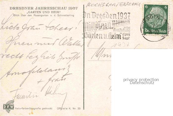 74041766 alte Postkarte Reichsgartenschau 1937 Jahresschau DRESDEN Rosengarten Schmetterling postalisch gelaufen Erhaltung siehe scans [IrynaD87] KatCode: 11110014262000