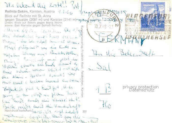 73134915 alte Postkarte Reifnitz Woerthersee Sekirn St. Anna Saualpe Koralpe postalisch gelaufen Erhaltung siehe scans [NatalD47] KatCode: 11390