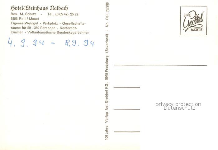 73543059 Reil Mosel Hotel Weinhaus Nalbach Restaurant Kegelbahn postalisch nicht gelaufen Erhaltung siehe scans [FriedD77] KatCode: 11110007231110