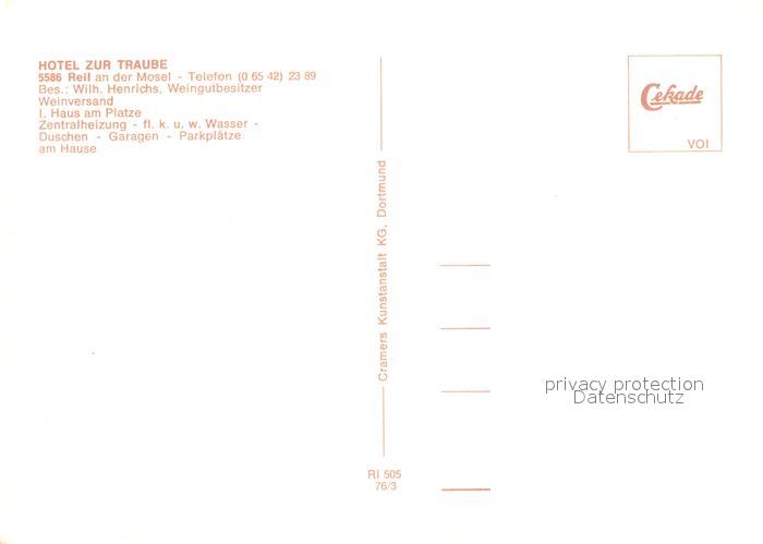 73671849 Reil Mosel Weinberg Moselpartien Kreuz Hotel zur Traube Kirche postalisch nicht gelaufen Erhaltung siehe scans [WerneD78] KatCode: 11110007231110