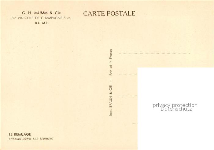 13662463 Reims Champagne Ardenne G.H. Mumm et Cie Ste Vinicole de Champagne Succ Le Remuage postalisch nicht gelaufen Erhaltung siehe scans [WerneD78] Wern Katcode 11170051351454