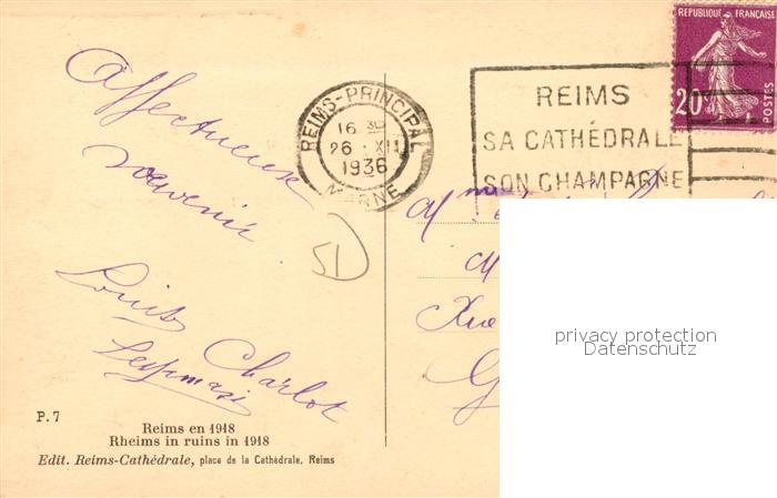 13136168 carte postale Reims Champagne Ardenne Kriegszerstörte Kathedrale postalisch gelaufen Erhaltung siehe scans [KathaD81] KatCode: 11170051351454