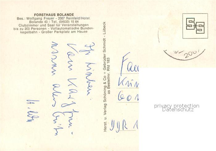 73730853 alte Postkarte Reinfeld Holstein Forsthaus Bolande postalisch gelaufen Erhaltung siehe scans [LiesaD40] KatCode: 11110001062061