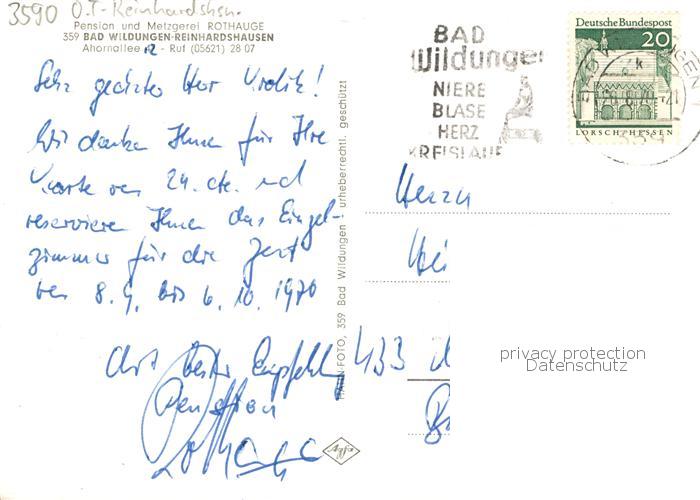 73863280 alte Postkarte Reinhardshausen Pension Metzgerei Rothauge postalisch gelaufen Erhaltung siehe scans [FriedD77] KatCode: 11110006635003