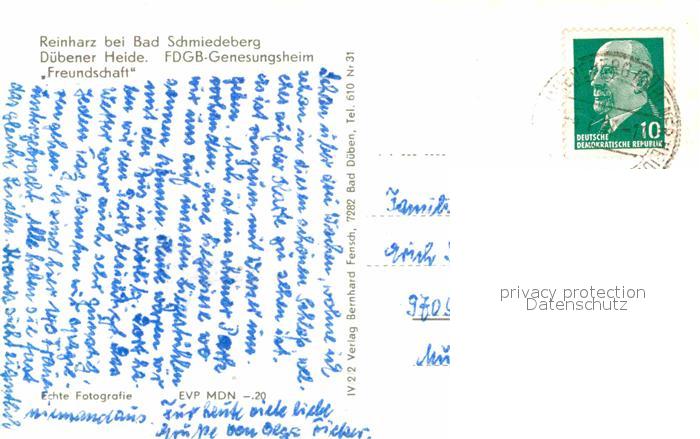 72728694 alte Postkarte Reinharz Duebener Heide FDGB Genesungsheim Freundschaft postalisch gelaufen Erhaltung siehe scans [FriedD77] KatCode: 11110015091020