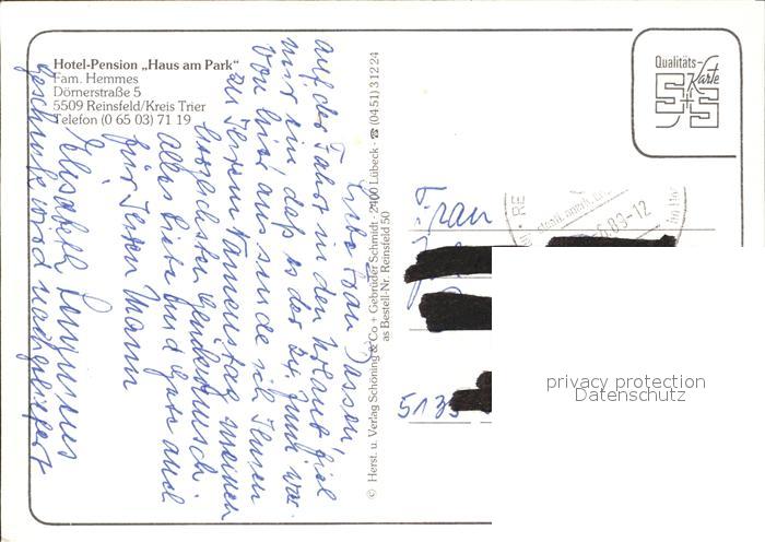 72377585 alte Postkarte Reinsfeld Hunsrueck Hotel Pension Haus am Park Speiseraum Garten postalisch gelaufen Erhaltung siehe scans KatCode: 11110007235114