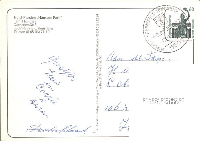 72223699 alte Postkarte Reinsfeld Hunsrueck Hotel- Pension Haus am Park postalisch gelaufen Erhaltung siehe scans KatCode: 11110007235114