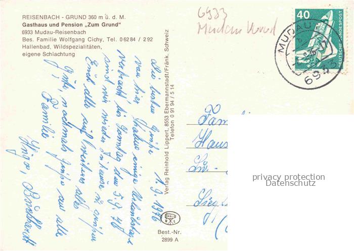 74047633 alte Postkarte Reisenbach Mudau Neckar-Odenwald-Kreis BW Gasthaus Pension Zum Grund Gastraum Terrasse Hallenbad postalisch gelaufen Erhaltung siehe scans [WerneD78] KatCode: 11110008225060