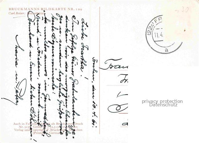 74092252 alte Postkarte REISER Carl Kuenstlerkarte Blumenstueck Vase Nr. 109 Muenchen postalisch gelaufen Erhaltung siehe scans [SanaeD93] KatCode: 22240000003200