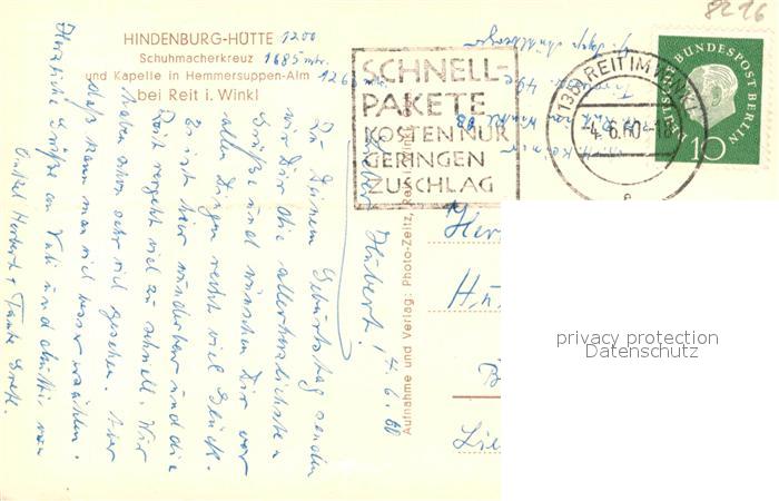 43494258 alte Postkarte Reit Winkl Hemmerszppenalm Hindenburg Huette Schumacherkreuz Kapelle postalisch gelaufen Erhaltung siehe scans [KathaD81] KatCode: 11110009189139