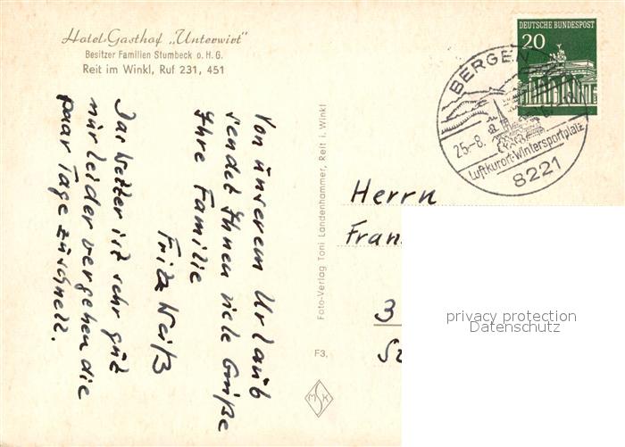 73111940 alte Postkarte Reit Winkl Hotel Unterwirt postalisch gelaufen Erhaltung siehe scans [NatalD47] KatCode: 11110009189139