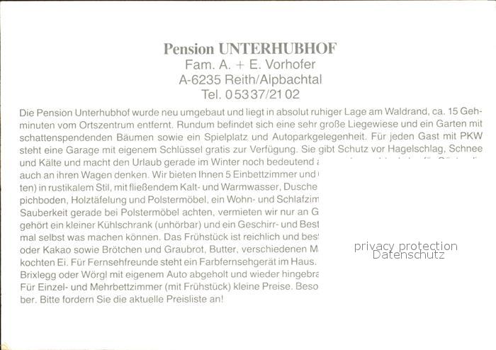 72246871 Reith Alpbachtal Pension Unterhubhof postalisch nicht gelaufen Werbekarte (keine Postkarte) Erhaltung siehe scans KatCode: 11390335070522