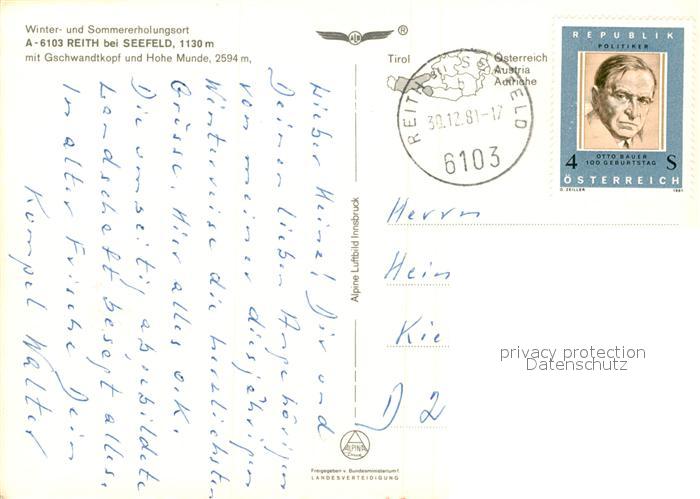 73125253 alte Postkarte Reith Seefeld Tirol Fliegeraufnahme Gschawndtkopf Hohe Munde postalisch gelaufen Erhaltung siehe scans [NatalD47] KatCode: 11390332070344