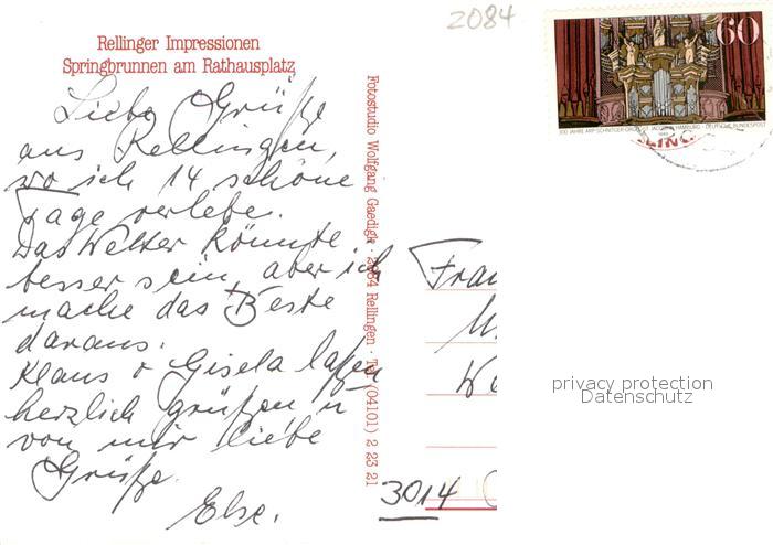 73672293 alte Postkarte Rellingen Springbrunnen am Rathausplatz postalisch gelaufen Erhaltung siehe scans [WerneD78] KatCode: 11110001056043