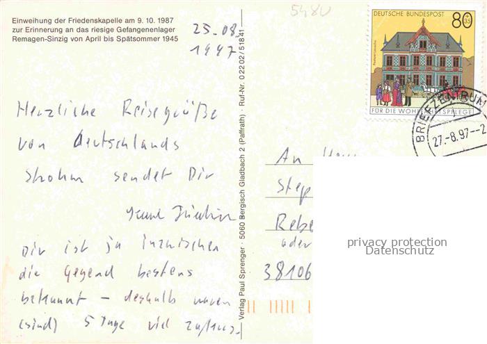 74050190 REMAGEN Rheinland-Pfalz Kapelle der Schwarzen Madonna postalisch gelaufen Erhaltung siehe scans [WerneD78] alte Postkarte Wern Katcode 11110007131070