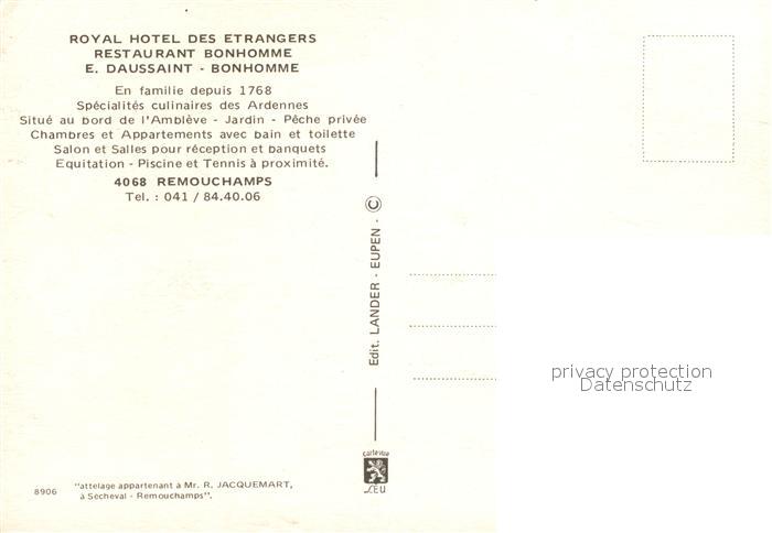 13220452 Remouchamps Liege Royal Hotel des Etrangers Restaurant Bonhomme postalisch nicht gelaufen Erhaltung siehe scans [LiesaD40] KatCode: 11070062001431
