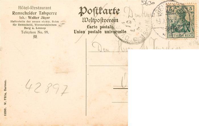 73898836 alte Postkarte Remscheid Hotel Restaurant Remscheider Talsperre im Eschbachtale postalisch gelaufen Erhaltung siehe scans [WerneD78] KatCode: 11110005120000