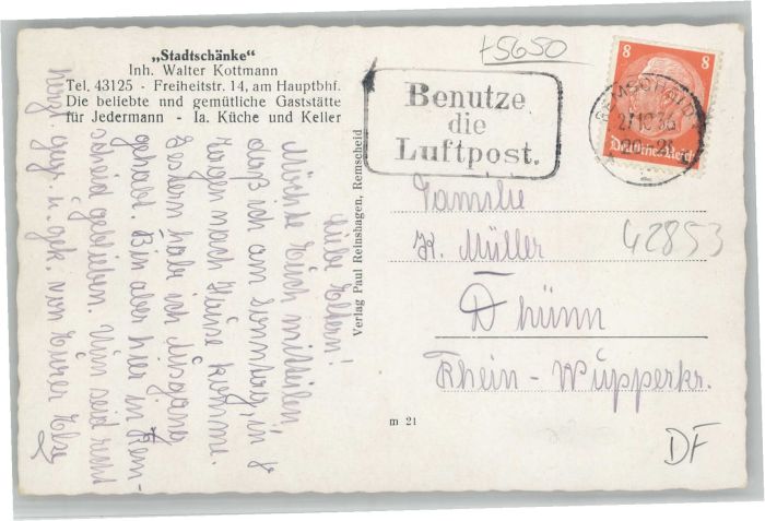 40689475 REMSCHEID NRW [Stempelabschlag] Stadtschaenke postalisch gelaufen Alte Ansichtskarte Postkarte alte Postkarte Katcode 11110005120000