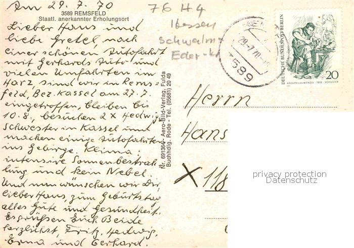 72889891 alte Postkarte Remsfeld Panorama Erholungsort postalisch gelaufen Erhaltung siehe scans [FriedD77] KatCode: 11110006634011