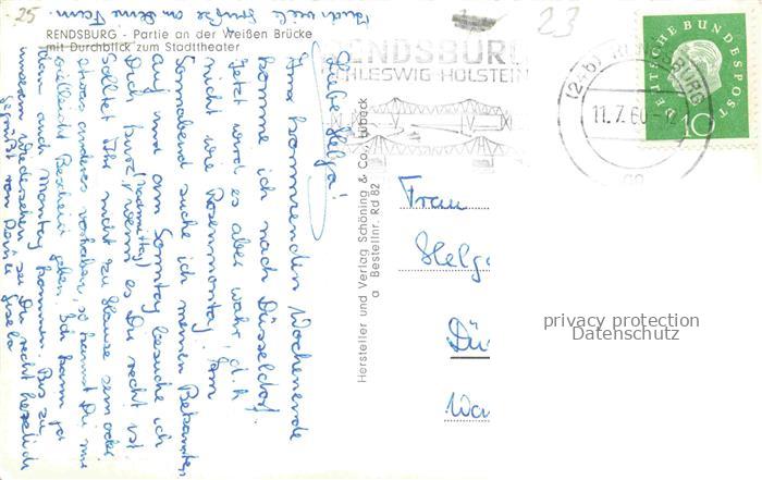 74149616 alte Postkarte Rendsburg Schleswig-Holstein Partie an der weissen Bruecke mit Durchblick zum Stadttheater postalisch gelaufen Erhaltung siehe scans [FriedD77] KatCode: 11110001058135