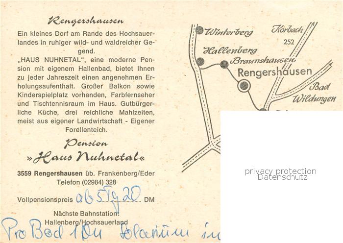 73651715 Rengershausen Frankenberg Eder Pension Haus Nuhnetal Hallenbad Restaurant Landschaftspanorama postalisch nicht gelaufen Werbekarte (keine Postkarte) Erhaltung siehe scans [FriedD77] KatCode: 11110006635011