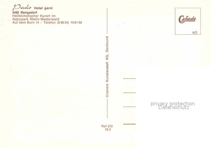 72837124 Rengsdorf Pado Hotel garni Kurort Naturpark Rhein Westerwald postalisch nicht gelaufen Erhaltung siehe scans [FriedD77] KatCode: 11110007138061